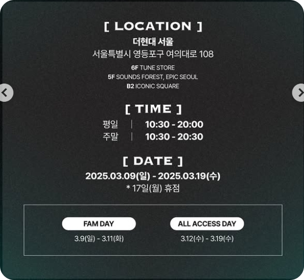 ✔️ 포토존 및 홀로그램 이벤트: 지하 2층 아이코닉 스퀘어에서는 뮤직비디오 세트장 무드를 재현한 포토존과 홀로그램 촬영 이벤트가 마련되어, 팬들에게 특별한 추억을 선사합니다.